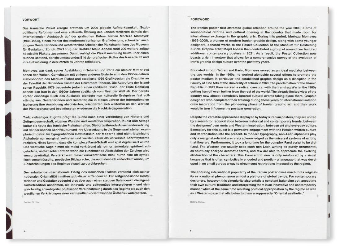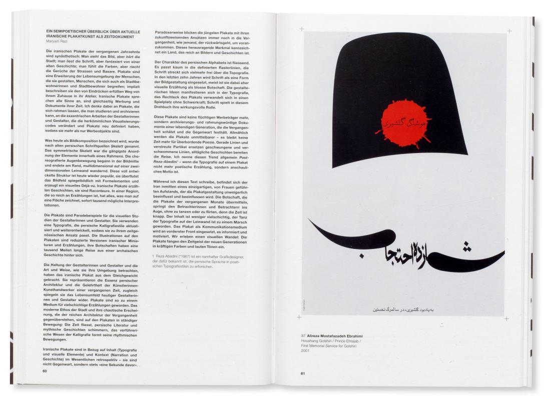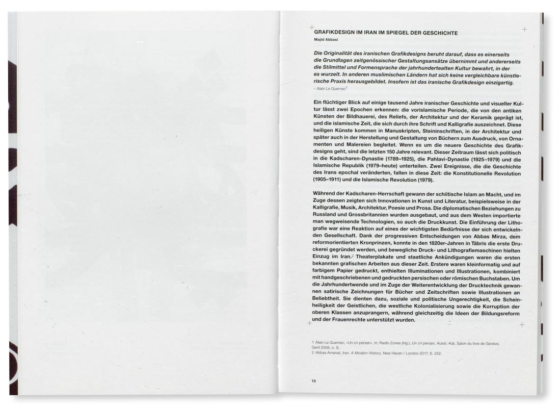 Iranisches Grafikdesign blickt auf eine junge Geschichte zurück. Erste Plakatgestalterinnen und -gestalter absolvierten noch eine freie künstlerische Ausbildung und entwarfen in den 1960er-Jahren malerisch-illustrative Arbeiten. Die zeitgleich erfolgte Öffnung zum Westen unter Schah Mohammad Reza Pahlavi beförderte den globalen kulturellen Austausch. Mit Ausrufung der Islamischen Republik 1979 und dem Ersten Golfkrieg (1980–1988) wurde dieser jedoch rapide unterbrochen. Ende der 1980er-Jahre knüpfte eine neue Generation von Gestalterinnen und Gestaltern an das grafische Erbe der Vorkriegszeit an. Um die Jahrtausendwende eroberte das iranische Plakat schliesslich internationale Festivals und erregte in der westlichen Community grosses Aufsehen.