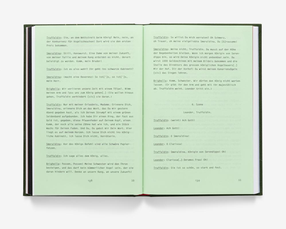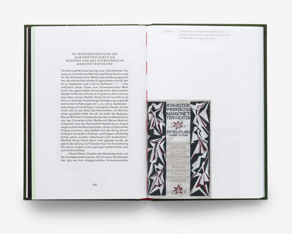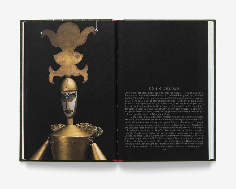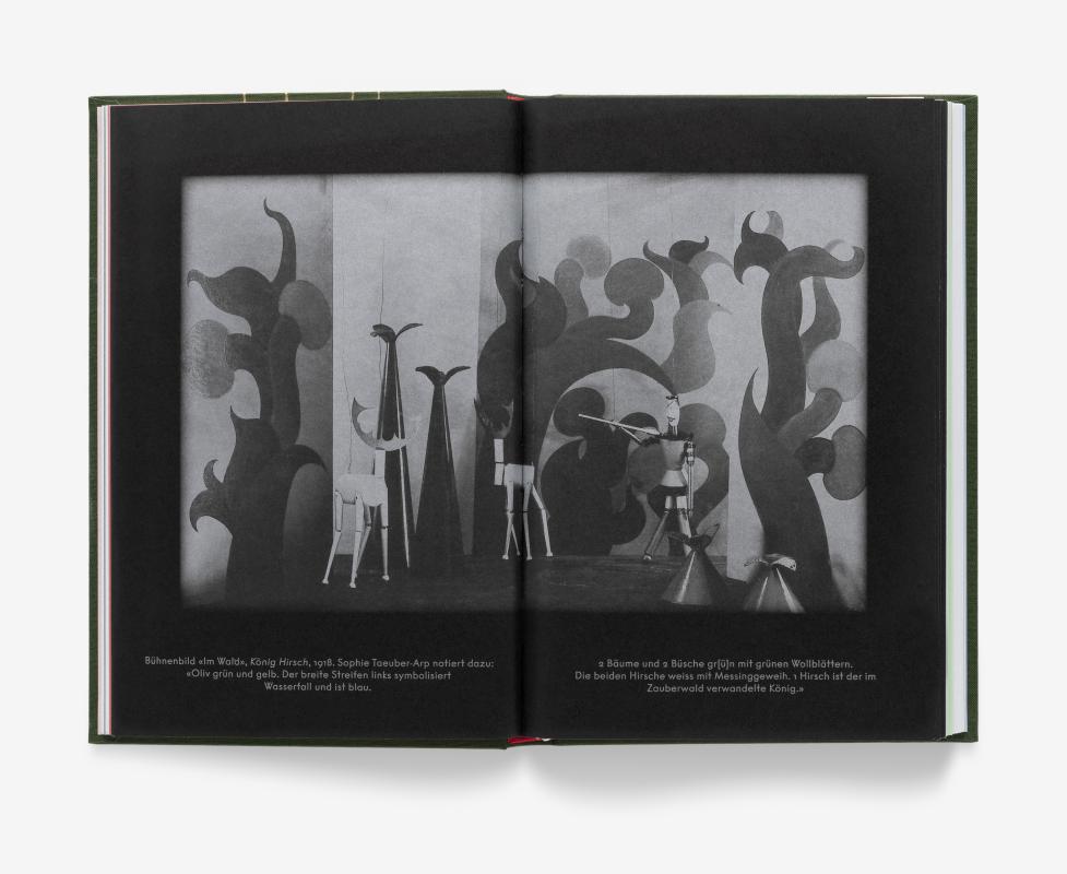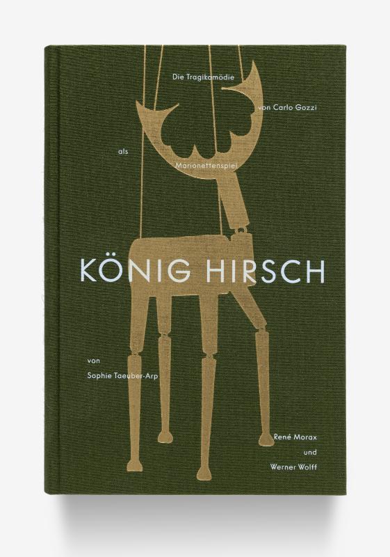 Die Marionetten zum Stück König Hirsch gehören längst zu den Ikonen der künstlerischen Avantgarde. Sophie Taeuber-Arp hat sie 1918 entlang ihrer Rollen als eigenwillige Charaktere mit geometrischen Körpern und maskenhaften Gesichtern geschaffen, als tänzerische Figuren mit angegriffenem Nervenkostüm in einer angespannten und intensiven Epoche. Die Künstlerin liess damit die konventionelle naturalistische Darstellungsform des Genres weit hinter sich. Mit der erstmaligen Veröffentlichung rückt die unterhaltsame Textvorlage der beiden Dramatiker René Morax und Werner Wolff nun zum illustren Ensemble auf. In der modernen Adaption des Theaterstücks Il re cervo von 1762 aus der Feder von Carlo Gozzi entfalten sich amouröse Handlungen sowie grober Zank und Handgemenge rund um die Brautschau des amtierenden Königs Deramo. Eine magische Statue fungiert als Werkzeug zur Seelenanalyse der Bewerberinnen – und der König verwandelt sich einstweilig in einen Hirsch.
