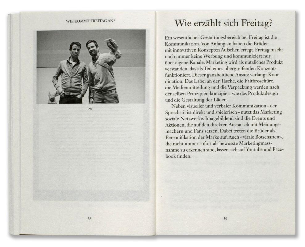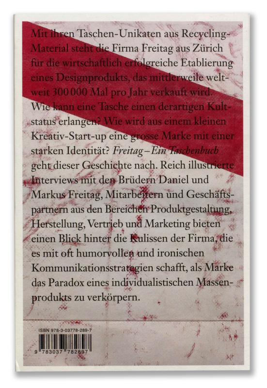 Mit ihren Taschen-Unikaten aus Recyclingmaterial steht die Firma Freitag aus Zürich für die wirtschaftlich erfolgreiche Etablierung eines Designprodukts, das mittlerweile weltweit 300 000-mal pro Jahr verkauft wird. Wie kann eine Tasche einen derartigen Kultstatus erlangen? Wie wird aus einem kleinen Kreativ-Start-up eine grosse Marke mit einer starken Identität? Freitag. Ein Taschenbuch geht dieser Geschichte nach. Reich illustrierte Interviews mit den Brüdern Daniel und Markus Freitag, Mitarbeitern und Geschäftspartnern aus den Bereichen Produktgestaltung, Herstellung, Vertrieb und Marketing bieten einen Blick hinter die Kulissen der Firma, die es mit oft humorvollen und ironischen Kommunikationsstrategien schafft, als Marke das Paradox eines individualistischen Massenprodukts zu verkörpern.