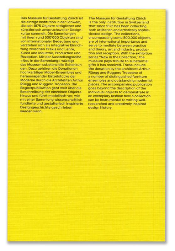 Das Museum für Gestaltung Zürich ist die einzige Institution in der Schweiz, die seit 1875 Objekte alltäglicher und künstlerisch anspruchsvoller Designkultur sammelt. Die Sammlungen mit ihren rund 500'000 Objekten sind von internationaler Bedeutung und verstehen sich als integrative Einrichtung zwischen Praxis und Lehre, Kunst und Industrie, Produktion und Rezeption. Die Publikation Interieurs und Möbel. Donationen Arthur Rüegg und Ruggero Tropeano geht weit über die Beschreibung der einzelnen Objekte hinaus und führt modellhaft vor, wie mit einer Sammlung wissenschaftlich fundierte und gestalterisch inspirierte Designgeschichte geschrieben werden kann.