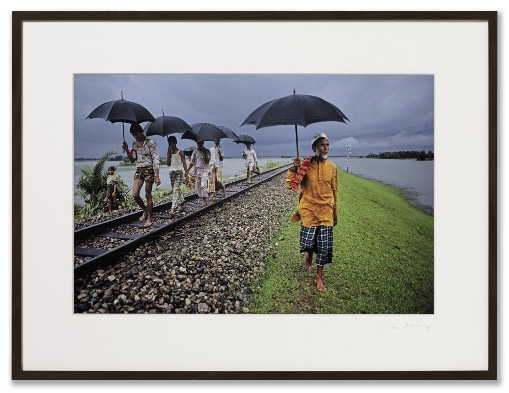 Der Amerikaner Steve McCurry (*1950) erlangte 1979 weltweite Berühmtheit, als er als Mudschaheddin getarnt die ersten Bilder aus dem von den Sowjets besetzten Afghanistan schmuggelte. Dort machte er 1985 in einem Flüchtlingscamp auch seine zur Ikone gewordene Fotografie des afghanischen Mädchens Sharbat Gula. McCurrys Nähe zu Asien ist seit diesen Reisen ungebrochen. Er dokumentiert verschwindende Kulturen und ihre Traditionen, die Folgen der Globalisierung und die Veränderungen der Lebenszusammenhänge. Walking on High Ground entstand im Rahmen eines mehrjährigen Bildzyklus zum Monsun und zeigt, wie dieses Wetterphänomen den Alltag der Menschen prägt.