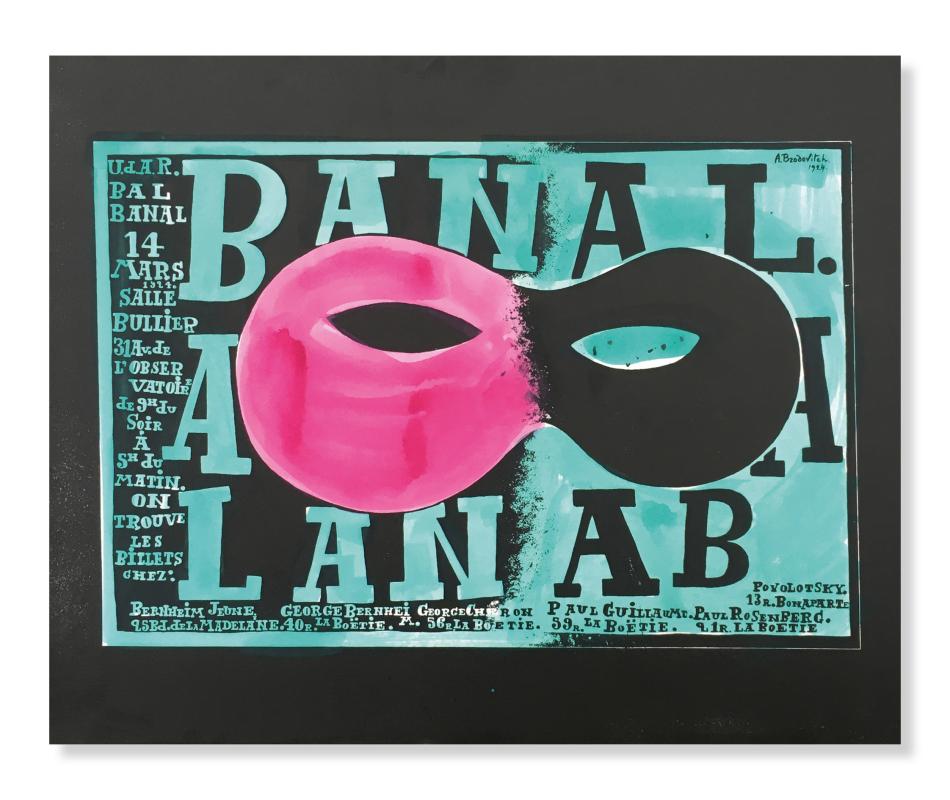Alexey Brodovitch (1898-1971) etabliert sich nach seiner Flucht aus dem revolutionären Russland gegen Ende der 1920er Jahre als Leitfigur zeitgenössischer Grafik in Paris. Im Plakatwettbewerb für den alljährlichen Ball der «Union des Artistes Russes (U.A.R.)» setzt er sich u.a. gegen Pablo Picasso durch. «Bal Banal steht für den Beginn meiner Karriere», so Brodovitch, der seine Initialen prominent ins Plakat integriert. Der schwarz-weisse Verlauf versinnbildlicht die Verwandlung durch die Maske, die ihrerseits von einer freien Typografie umtanzt wird. Die einfarbigen Lithografien werden von Brodovitch von Hand in Magenta und Wassergrün koloriert und vor allem im Pariser Stadtviertel Montparnasse grosszügig an die Fassaden gekleistert. Ursprünglich plant Brodovitch, das Plakat auch negativ umzusetzen, wie eine im Museum of Modern Art / New York erhaltene Collage zeigt. Anlässlich der Ausstellung «Alexey Brodovitch – Der erste Art Director» legt der Freundeskreis des Museum für Gestaltung Zürich dieses Schlüsselwerk neu und in beiden Varianten auf. Die Lithografien des Steindruckateliers Wolfensberger, Zürich wurden durch Museumsdirektor Christian Brändle einzeln koloriert.
